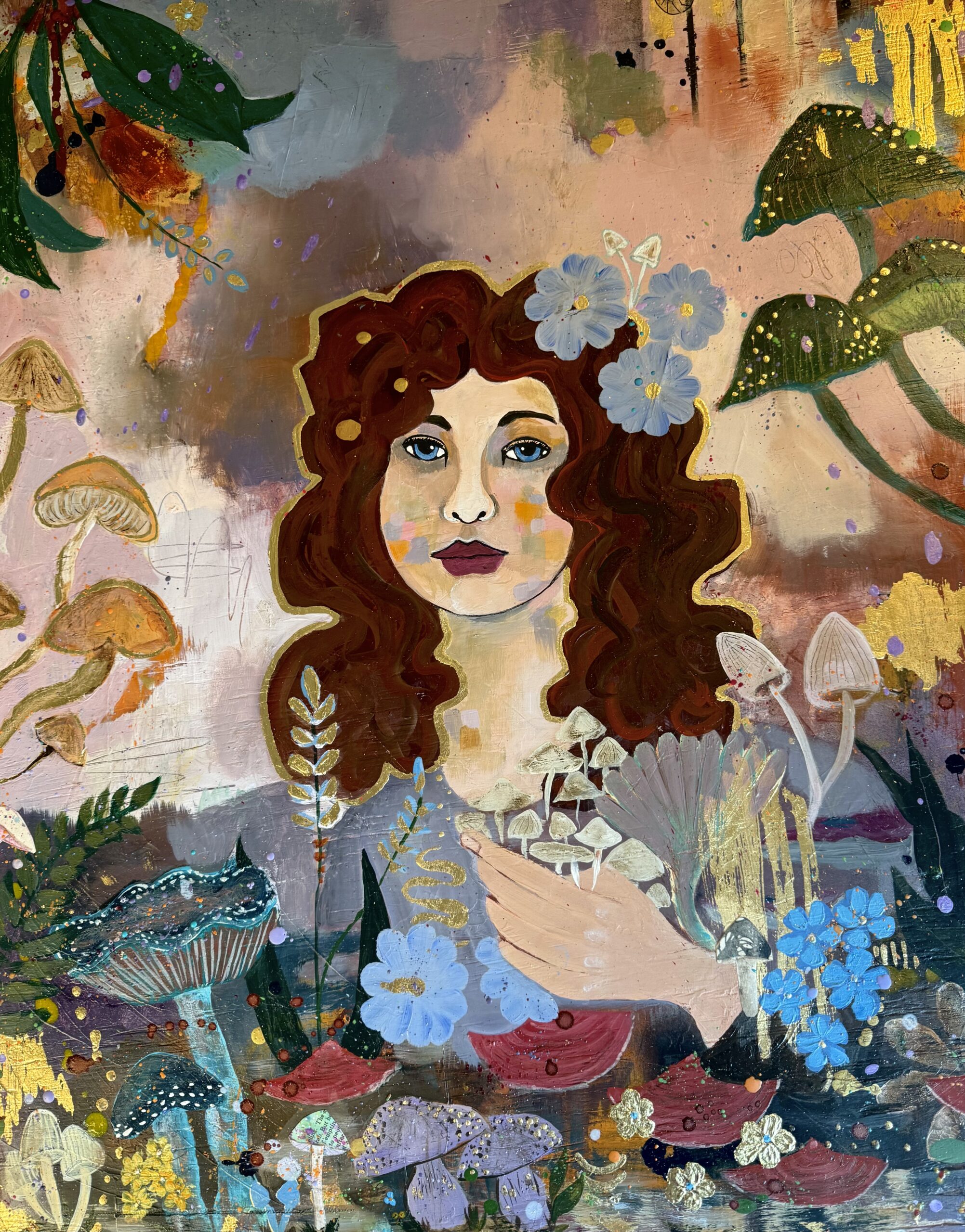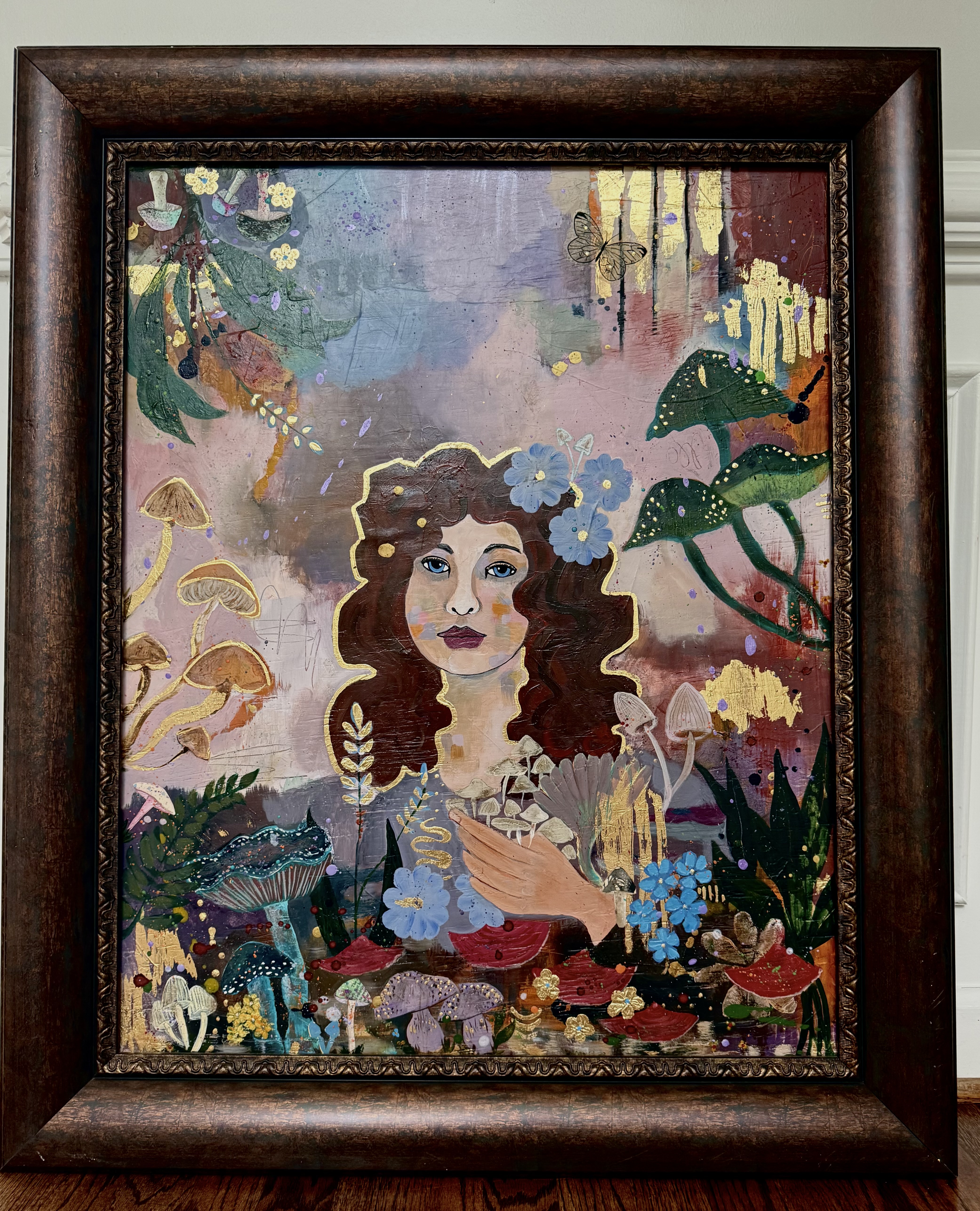 Mushroom Muse is a Mixed Media painting on wood panel measuring 26×32…framed and ready to hang.